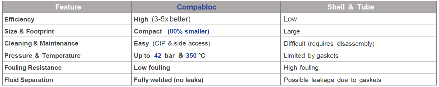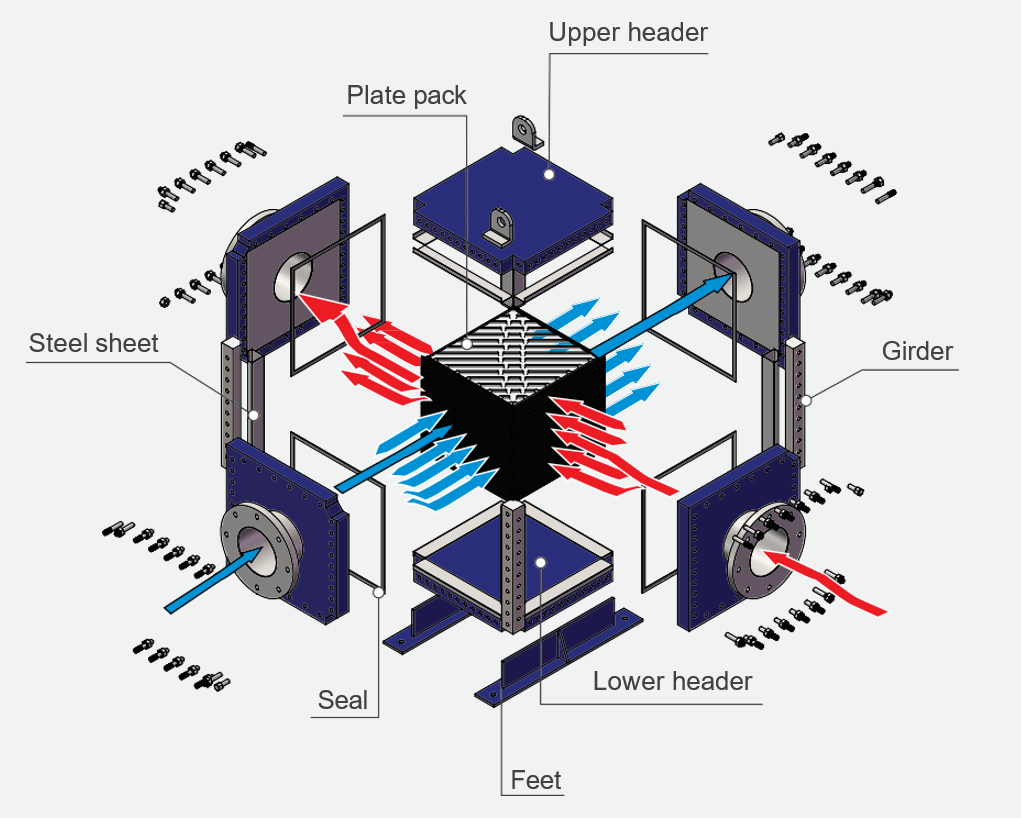 COMPAT BLOC HEX features a fully welded block-type structure composed of laser-welded corrugated plates enclosed within a rigid steel shell. The plate pack forms a series of alternating channels for two media to flow in cross-flow or counterflow configurations, ensuring high thermal efficiency.