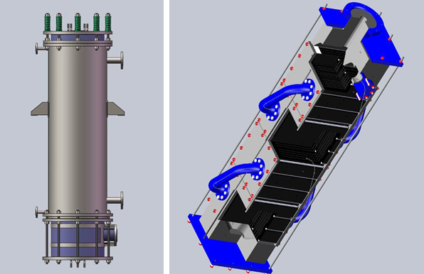 Graphite block heat exchangers consists of several impregnated graphite heat exchanger blocks with material channels, top and bottom impregnated graphite end caps, metallic cover plates (or end caps made of other materials), and a cylindrical shell (for circular block-hole type) or side plates at both ends (for rectangular block type). These components are sealed with gaskets and bolted together. The impregnated graphite heat exchanger blocks, encapsulated in steel components, can be either cylindrical or rectangular in shape. The heat exchanger blocks are drilled with a series of channels in both horizontal and vertical directions, forming process and service channels. Two fluids flow through channels in different directions, and heat is transferred through the graphite walls without direct contact between the fluids. Graphite block heat exchangers are one of the most common, flexible, and durable graphite heat exchangers used in corrosive industry applications. They are suitable for high-corrosion chemical fields and are typically used for cooling, condensation, heating, evaporation, and absorption processes.