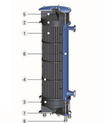 The tube bundle consists of graphite tubes, graphite tube sheets, support plates, and baffle plates. The tube bundle can be replaced as a single component. The baffle and support plates can be made from various materials such as carbon steel, PTFE, PP, etc.