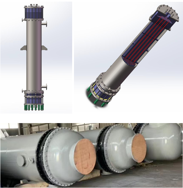 Shell and tube type graphite heat exchangers are suitable for applications involving highly corrosive chemicals and are commonly used for cooling, condensing, and absorption, but can also be used for heating and evaporation. Depending on the pressure, temperature, and heat transfer efficiency of the process conditions, various types of impenetrable graphite tubes can be selected, including standard tubes, medium-temperature tubes, impregnated tubes, and specially reinforced tubes (such as carbon fiber-reinforced tubes and inner plug tubes).