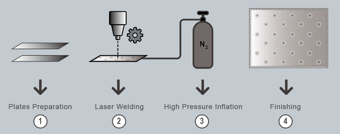 Pillow Plates are a type of heat exchanger plate made by welding two thin metal sheets together—typically using laser welding in a custom pattern—and then inflating them with high pressure to create a pillow-shaped, dimpled structure. This forms internal flow channels and an enlarged surface area for efficient heat transfer.