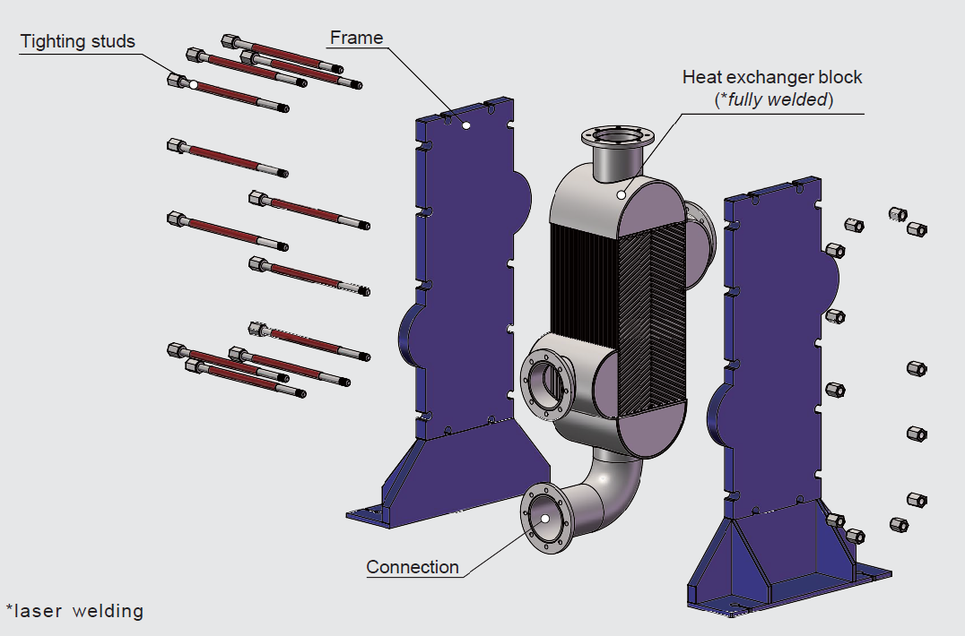 A Plate Block Heat Exchanger is a fully welded plate-type exchanger. It consists of corrugated metal plates welded together to form a compact block, with no gaskets, and enclosed in a pressure-retaining shell.