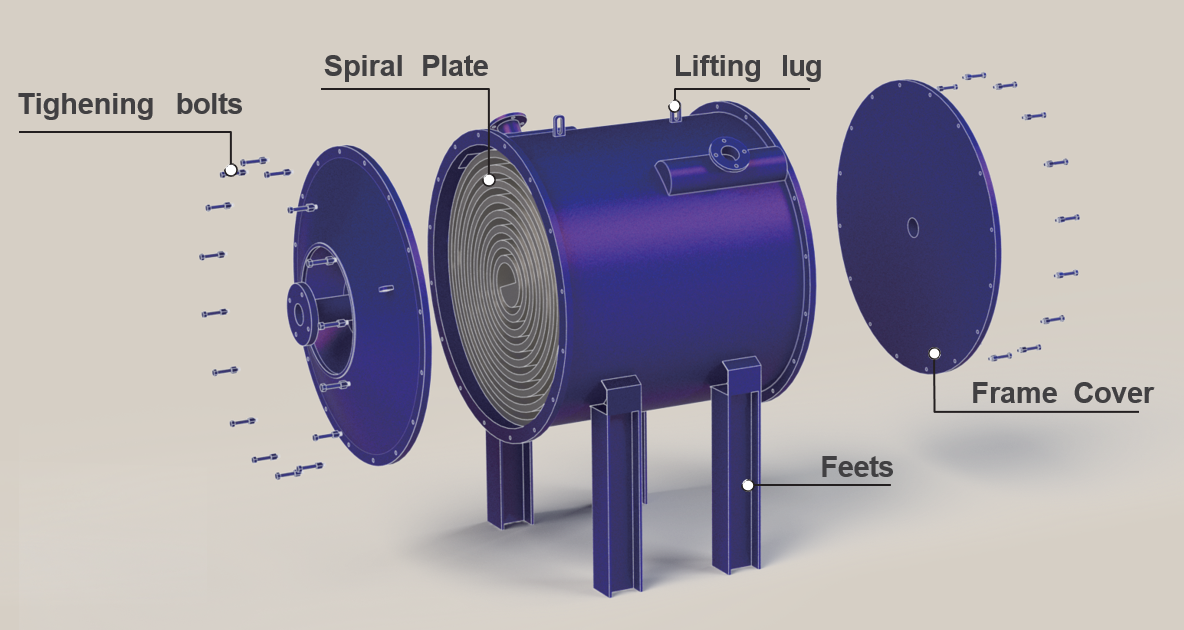 • Spiral Plate material: Carbon steel, 316L/304, Ti, 2205 Duplex, Titanium, Nickel alloys